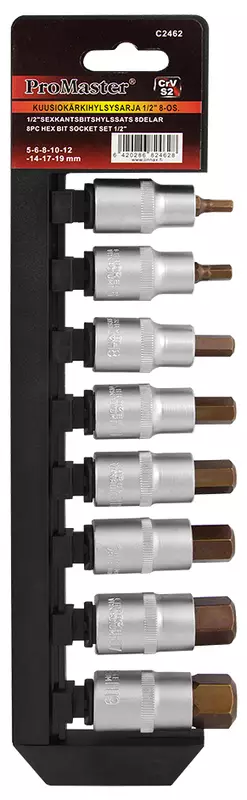 ProMaster -hylsyt kromi-vanadium -terästä -kärkien materiaali S2 -sarja sisältää koot 5, 6, 8, 10, 12, 14, 17, 19 mm -takuu 1 vuosi
