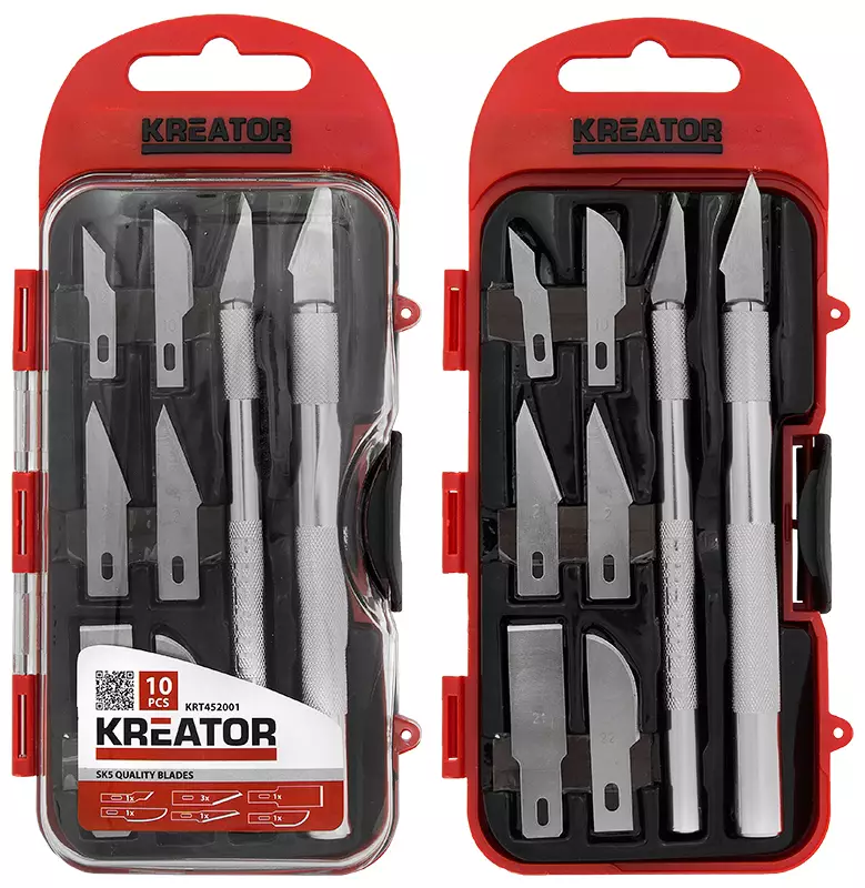 -tarkkuutta vaativaan leikkaamiseen 10-osainen veitsisarja -erilaisia teriä 8kpl -2kpl kahvoja -terät SK5-terästä -kahvat alumiinia