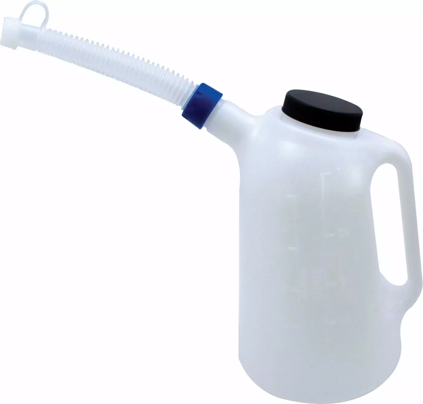 Mittakannu suljettavalla kaatonokalla ja kierrekorkilla jotka estävät höyryjen pääsyn ulos kannusta säilytyksen aikana. Mitta-asteikot: litra ja gallona. Tilavuus: 5L. Materiaali: korkeatiheyksinen polyeteeni.