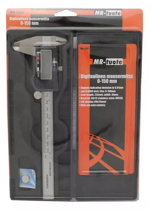 Digitaalinen mausermitta 0-150 mm Mittausalue 0-150 mm Tarkkuus 0,01 mm kokonaispituus 235 mm, leveys 16 mm LCD näyttö (40x13mm)
