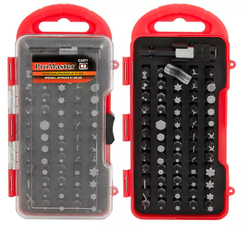 ProMaster -S2-terästä -61-osainen sarja sisältää --60 kpl 25mm 1/4" ruuvauskärkiä ---3 kpl ura: SL3-SL5.5-SL7mm ---3 kpl Phillips: PH0-PH1-PH2 ---1 kpl Phillips Reduced: PH2R (DW)... Lue lisää