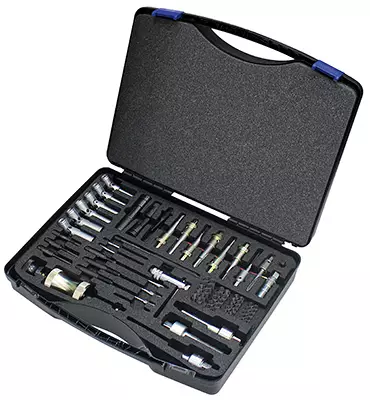 Yleismallinen KL-0132-56 KA -hehkutulppatyökalusarja alkuperäisten M8X1- ja M10X1-kierteiden tarkkaan poistamiseen, vahingoittuneen hehkutulpan pois poraamiseen ja uudelleenkierteytykseen. Se mahdollistaa myös vahingoittuneen kierteen korjaamisen poraten sen vastaavasti joko M10X1- tai M12X1-kierteeseen, jolloin uusi hehkutulppa asennetaan kierre-elementtiä käyttäen sylinterikanteen. Sarjaan sisältyvän paineilmaliittimen avulla voidaan paineilma kytkeä palotilaan, jolloin estetään lian ja lastujen joutuminen moottoriin. Hehkukanavaan juuttuneet hehkutulpat tai hehkusauvat voidaan poistaa nopeasti ja helposti ulosvetimellä, joka tulee sarjan mukana. Yleismallinen. Sopii dieselmoottoreille, joissa hehkutulpan kierre on M8x1 tai M10x1.