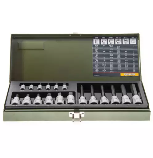Proxxon 18-osainen kuusiokolohylsysarja 1/4" vääntiö hylsyt: 2, 2.5, 3, 4, 5, 6mm 1/2" vääntiö hylsyt 55mm: 6, 7, 8, 10, 12, 14mm 1/2" vääntiö hylsyt 100mm: 5, 6, 7, 8, 10, 12mm... Lue lisää