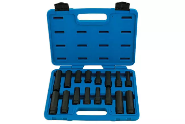 Yleissarja yleisimmille lukkomuttereille / -pulteille. Sarjaan kuuluu 16 yleisintä käytössä olevaa kokoa.Monesti autosta on ajan saatossa hävinnyt hylsy lukkomuttereille / -pulteille ja siksi renkaanvaihdossa tuhlaantuu turhaan aikaa. Sarjasta löytyvillä hylsyillä pystymme monesti jatkamaan töitä, ilman lukkomutterin / -pultin rikkomista.
