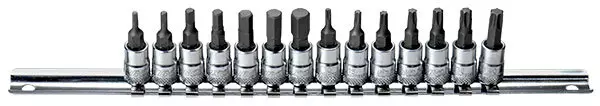 14-Osainen 1/4" hylsysarja kiskossa sisältää: Torx T10, T15, T20, T25, T27, T30, T40 Kuusiokolo 2.5, 3, 4, 5, 6, 7, 8 mm