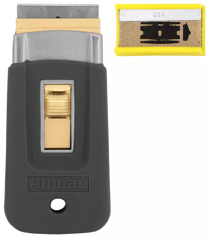 Turvallinen ikkunakaavin kumisella varrella - Terä on sisäänvedettävä - Mukana 5 terää - Terän leveys 40 mm - IP-ripustinpakkaus