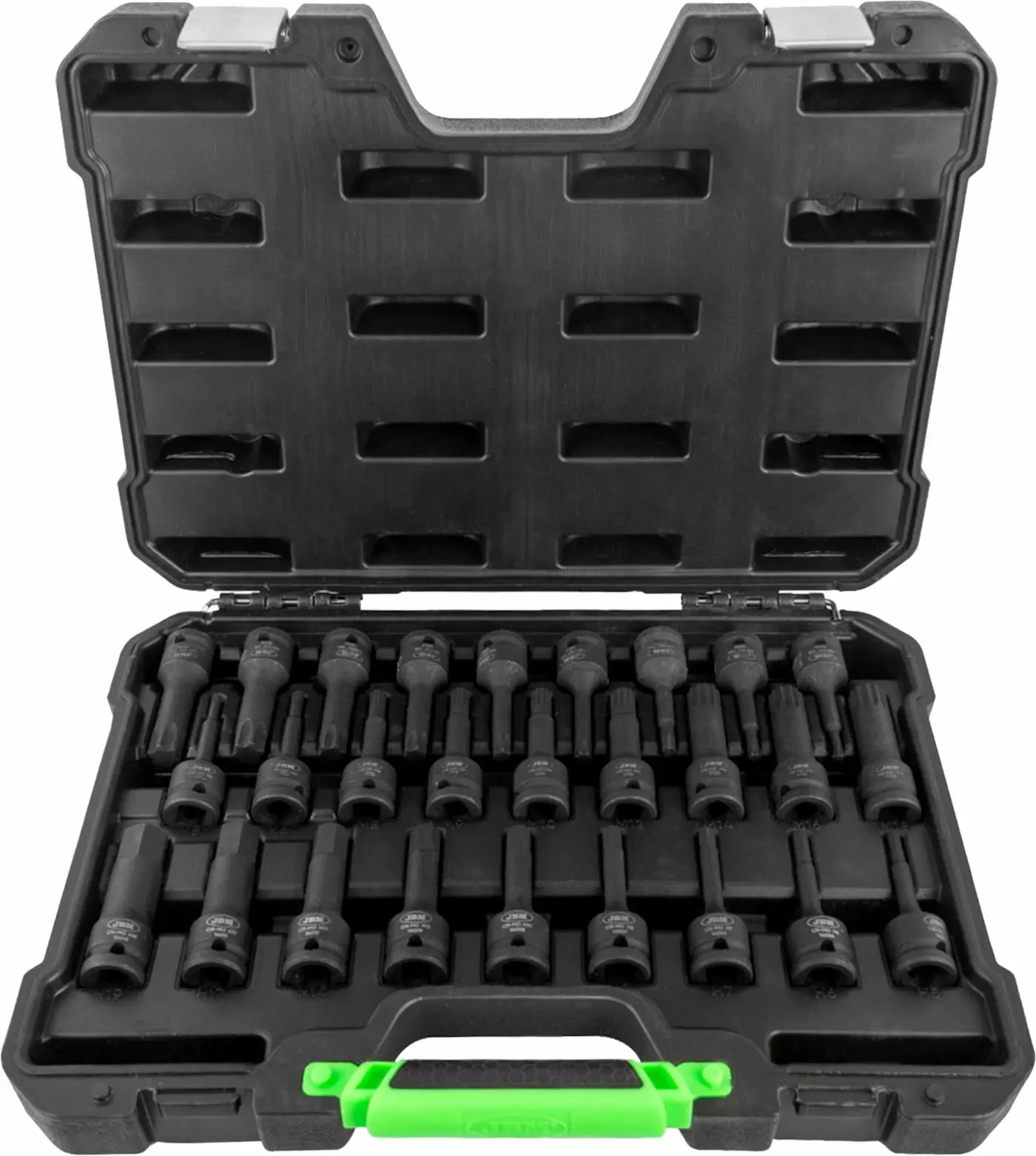 1/2" pitkä voimakärkihylsysarja, pituus 78mm. Sarja sisältää: kuusiokolot 5, 6, 7, 8, 10, 12, 14, 17, 19mm, Torx T25, T30, T40, T45, T50, T55, T60, T70, T80. XZN M5, M6, M8, M9, M10, M12, M14, M16, M18.