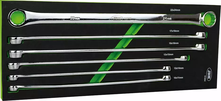 JBM erikoispitkä lenkkiavainsarja 6 osaa. Sisältää avaimet: 10x11mm/ 290mm 12x14mm/ 330mm 13x15mm/ 368mm 16x18mm/ 407mm 17x19mm/ 407mm 22x24mm/430mm.