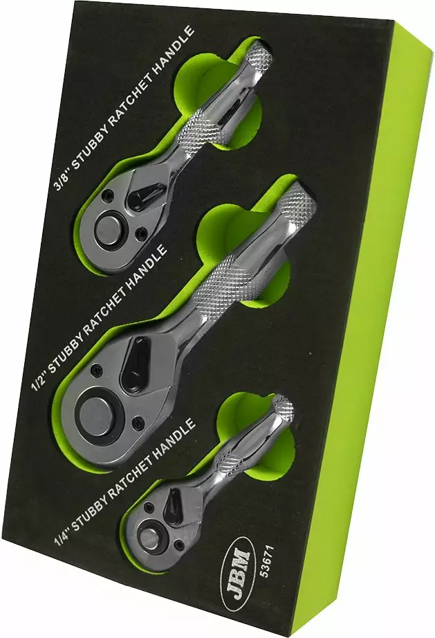 Lyhyt räikkäväänninsarja foamissa. Sisältää metallikahvaiset räikkävääntimet: 1/4" 72z 85mm 3/8" 72z 102mm 1/2" 72z 135mm