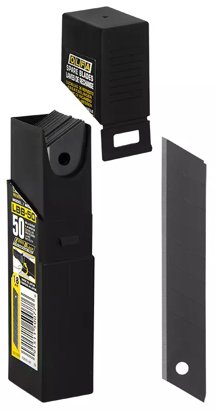 Olfa MADE IN JAPAN -musta erikoisterävä teräpakkaus -soveltuu 18 mm katkoteräveitsille -pakkaus sisältää 50 kpl teriä -muovikotelo terille