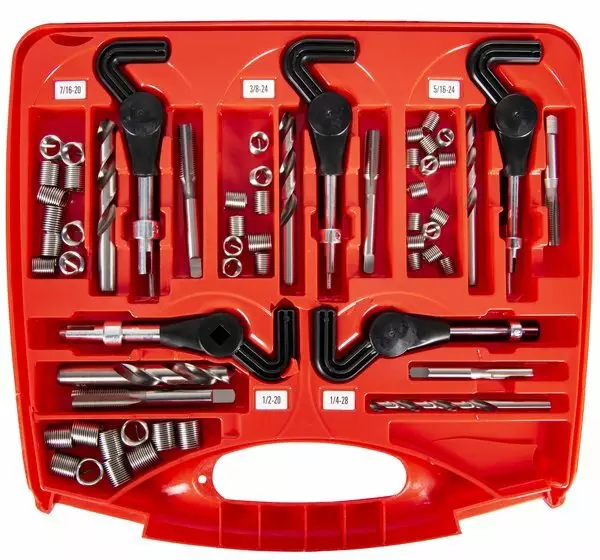 UNF-kierteille 1/4, 5/16, 3/8, 7/16 ja 1/2.Sisältää irtokierteitä, kierretapit, asennustyökalut sekä poranterät.