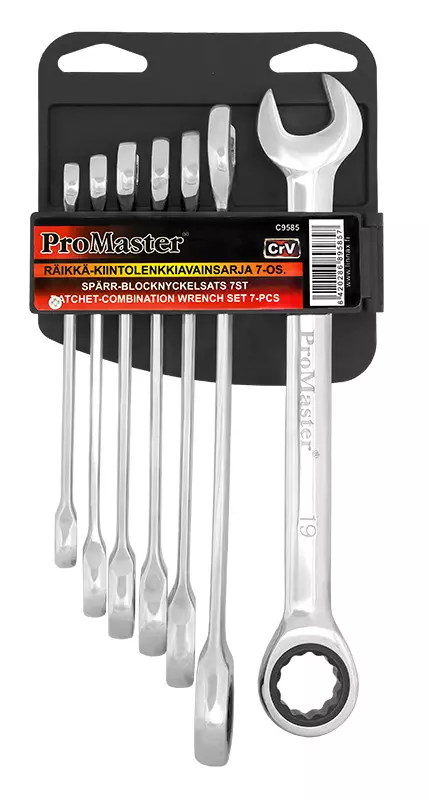 ProMaster -kromi- vanadium-terästä -7-osainen sarja sisältää koot 8, 10, 12, 13, 14, 17 ja 19 mm -silmukkapäässä 72-hampainen räikkä -IP-ripustinkahva -takuu 1 vuosi
