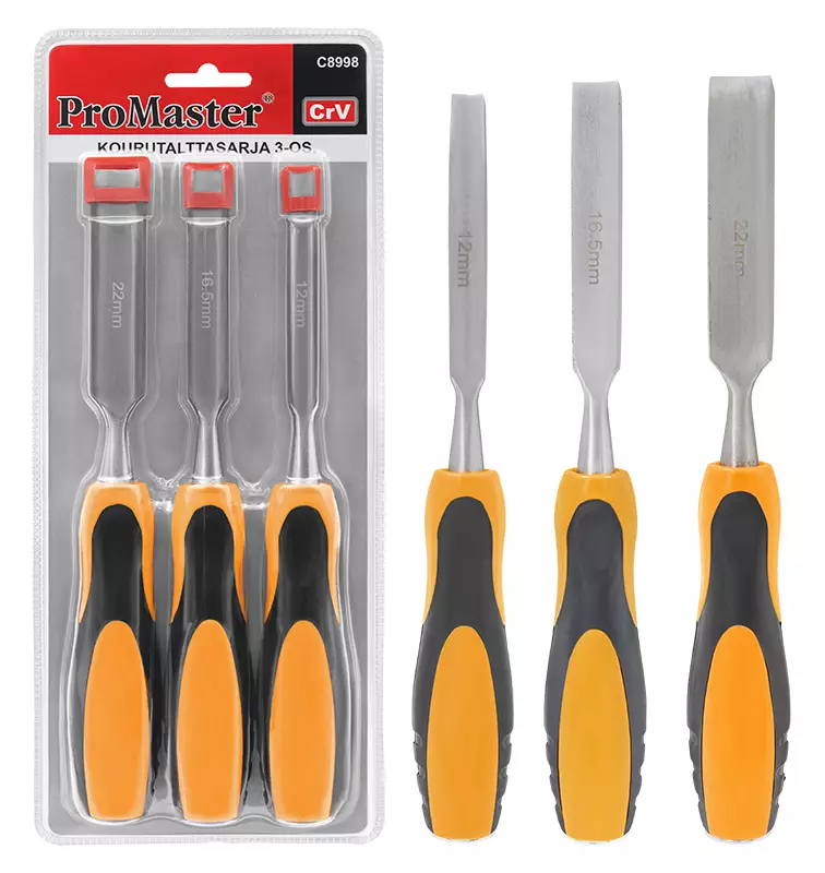 ProMaster -teräosa kromi-vanadium -terästä -kahva kumi-muoviseosta -sarja sisältää koot 12, 16.5 ja 22 mm -kahvan päässä metallinen lyöntipää -taltoissa teräsuojat -IP-ripustinpakkaus... Lue lisää