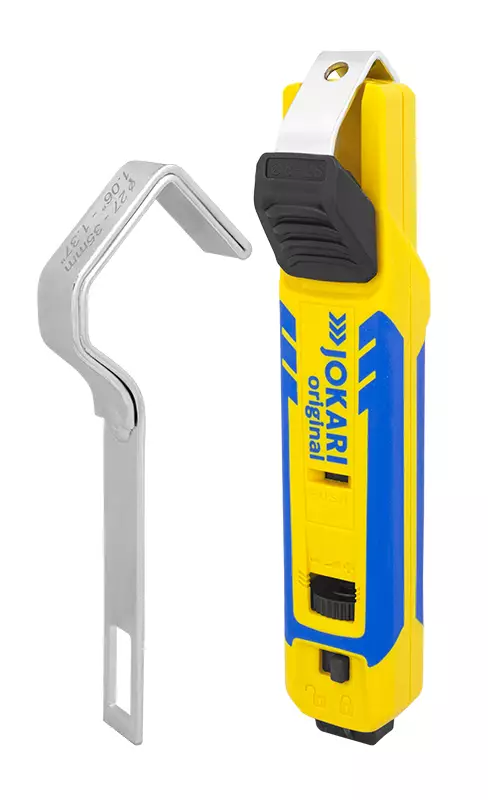 Jokari MADE IN GERMANY -leikkaa kaikkia yleisiä kaapelityyppejä (halk. 4-70 mm) -ammattikäyttöön suunniteltu kuorintaveitsi -kuorintaterän turvamekanismi vetää terän automaattisesti rungon... Lue lisää