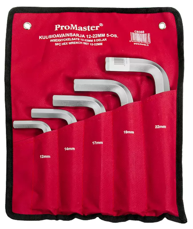 ProMaster -materiaali terästä -sarja sisältää koot 12, 14, 17, 19, ja 22 mm -kätevä käärittävä/ripustettava säilytyspussi -takuu 1 vuosi