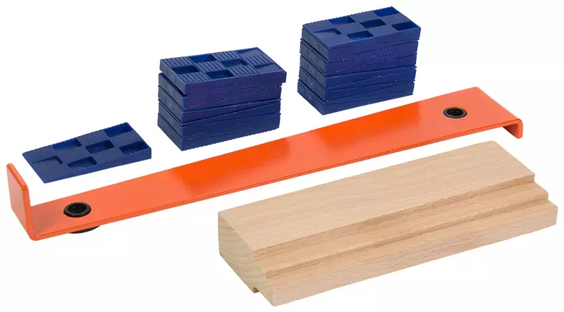 -sarja sisältää metallisen laminaattiraudan, puisen lyöntikapulan ja 20 kappaletta välikiiloja
