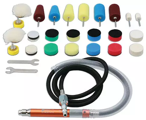 29 osaisella pneumaattisella kiilloitustyökalusarjalla kiillotat ja viimeistelet monimutkaisetkin alueet ilman pyörrejälkiä. Joustavan varren pituus 134cm, käännettävällä on/off mekanismilla. Sopii standardeihin 1/4" ilmaletkuihin maximi ilmanpaine 90psi.