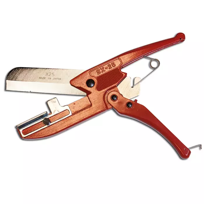 Leikkuri pehmeille materiaaleille esim letkuille. Pitkällä terällä ja leikkuu-uralla varustetut leikkurit. Leikkuu etenee portaattomasti. Pituus 285 mm, terä 110 mm
