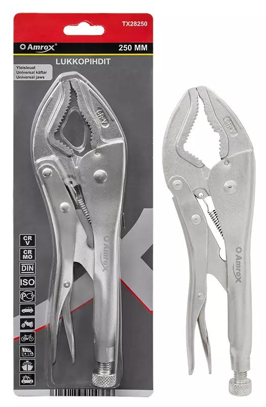 -leukojen materiaali kromi-vanadium -terästä -koko 250 mm -leukojen aukeama 0-55 mm -vapautusvipu helpottaa puristusotteen avaamista