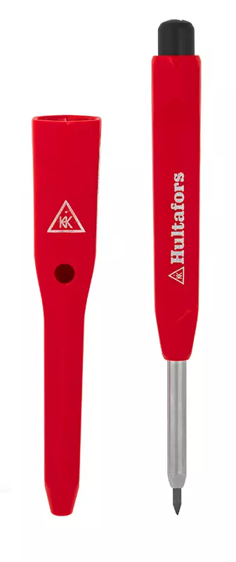Ergonominen kynä selkeään merkkaamiseen - kotelossa teroitin. Hultafors-merkintäkynä on helppo ottaa kotelostaan, siksi sinun ei tarvitse keskeyttää