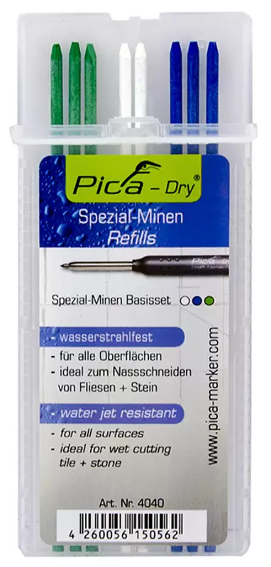 -sisältää 8 kpl varalyijyä --3kpl vihreä --2kpl valkoinen --3kpl sininen -lyijyn halkaisija 2,8mm, pituus 125mm -merkintään kaikille pinnoille -vedenkestävä