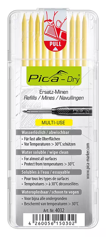 -sisältää 10 kpl keltaista varalyijyä -lyijyn halkaisija 2,8mm, pituus 125mm -merkintään kaikille pinnoille -vesiliukoinen