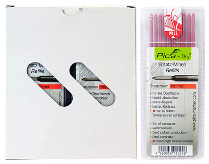-sisältää 10 kpl punaista varalyijyä -lyijyn halkaisija 2,8mm, pituus 125mm -merkintään kaikille pinnoille -vesiliukoinen -vältettävä korkeita lämpötiloja