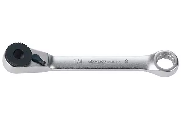 Räikkäväännin suunnanvaihdolla 1/4" bitseille. Toisessa päässä 8 mm lenkki.