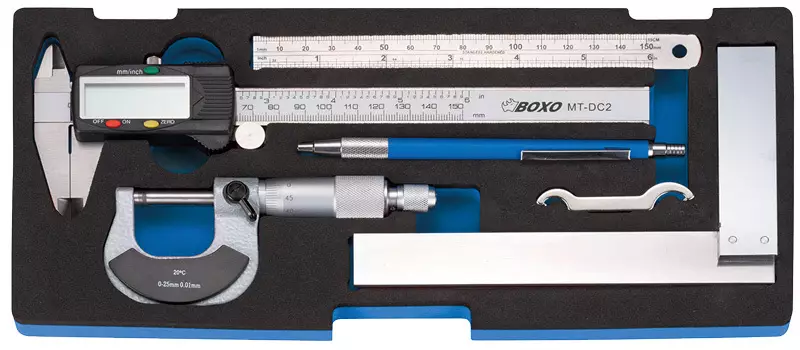 Mittausarja 5-osaa Boxo Työkaluvaunuun Sisältää: Digitaalinen työntömitta, mikrometri, suorakulma, teräsmitta, kynä.
