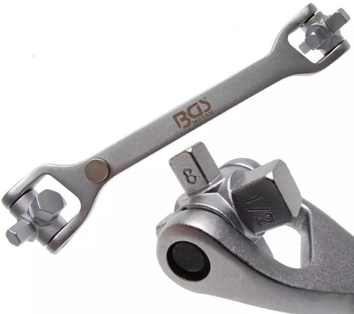Öljytulppa-avain 8-in-1 BGS 4 neliöpäätä: 8-10 mm ja 3/8" 1/2" 4 kuusiokolopäätä: 10-12-14-17 mm Kokonaispituus: 270 mm