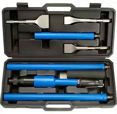 Iskuluku 2400 Isk./min. iskun pituus 33,2 mm, Vakiovarusteena 4 terää: leveydet 40,50,70 ja 100mm. kiinnitys kuusiokanta halk. 15mm, jatkopalat, ilmankulutus 79 l./min. ilmaliitäntä 1/4", pakattuna muovisalkkuun.