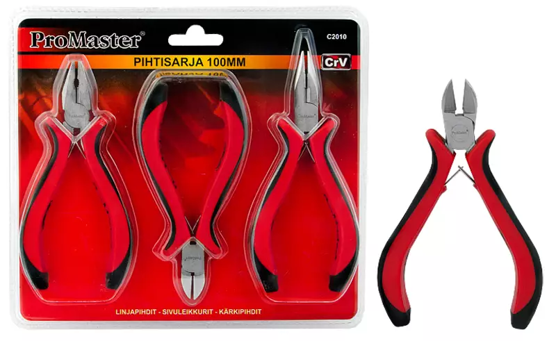 ProMaster -kromivanadium -terästä -erinomaiset pihdit ahtaissa paikoissa työskentelyyn -sarja sisältää: --linjapihdit 100 mm --kärkipihdit 100 mm --sivuleikkurit 100 mm
