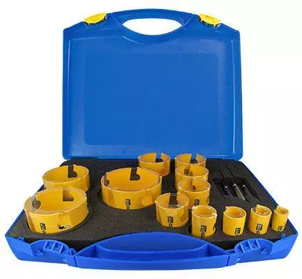 Sisältö: 12 reikäsahaa; 25, 32, 35, 40, 54 60, 68, 70, 73, 92, 102, 114 mm ja 4 keskiporaa