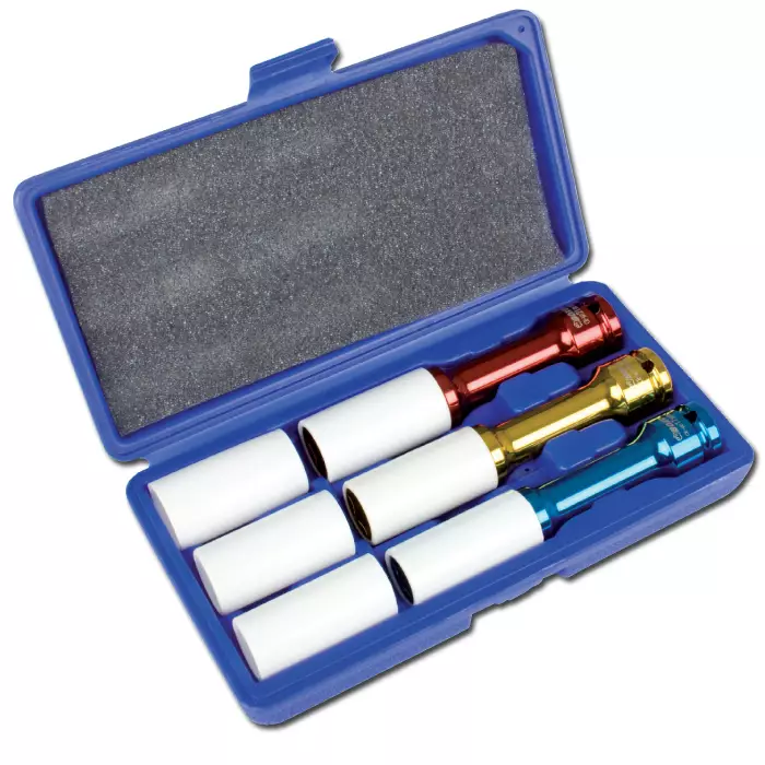 Sisältää 17, 19 ja 21 mm suojatut 150 mm pitkät rengashylsyt 1/2" vääntiöllä.