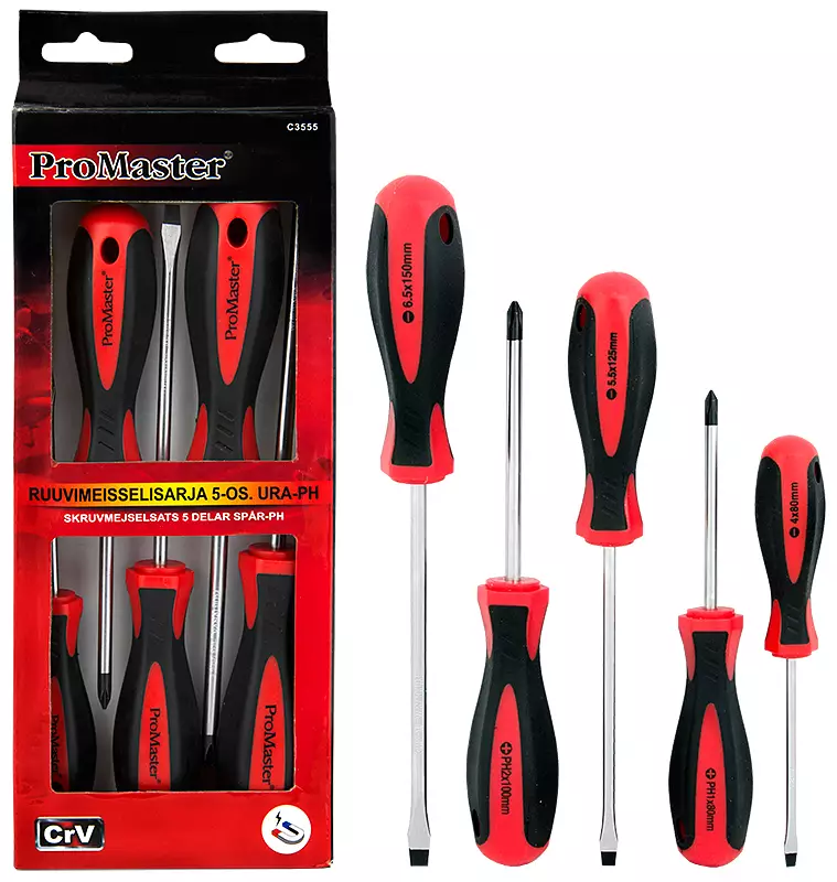 -kromi-vanadium -terästä -5-osainen sarja sisältää seuraavat ruuvimeisselit --3 kpl ura: 4x80mm, 5.5x125mm, 6.5x150mm --2 kpl Phillips: PH1x80mm, PH2x100mm -muotoiltu kaksikomponenttikahva... Lue lisää