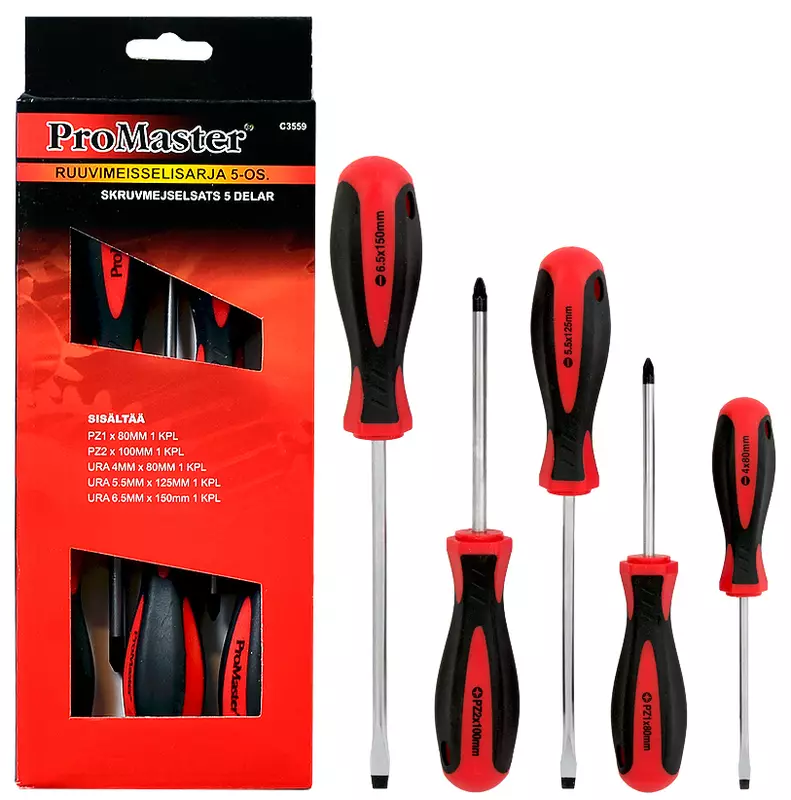 ProMaster -kromi-vanadium -terästä -5-osainen sarja sisältää seuraavat ruuvimeisselit --3 kpl ura: 4.0x80mm, 5.5x125mm, 6.5x150mm --2 kpl Pozi: PZ1x80mm, PZ2x100mm -muotoiltu... Lue lisää
