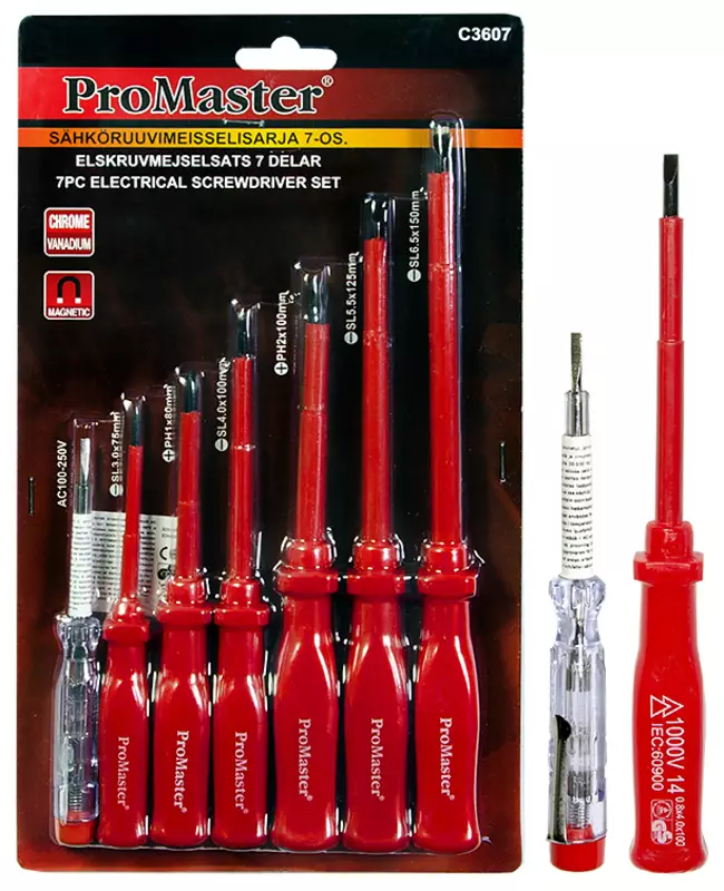ProMaster -eristetyt sähkömeisselit 1000V AC työskentelyolosuhteisiin -GS-testattu standardin EN60900 mukaisesti otoksella -sarja sisältää : --6 kpl sähköruuvimeisseleitä ---ura 0.5x3.0x75... Lue lisää