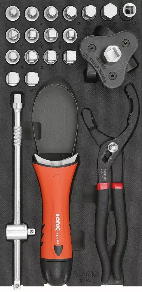 Sarjassa öljynvaihtoon tarvittavat työkalut. Sisältäen esimerkiksi: Yleisimmät öljytulpanavaimet, öljynsuodatinavaimet mallia pihti, panta ja 3-leukainen suodatinavain sekä väännin öljytulpanavaimille.