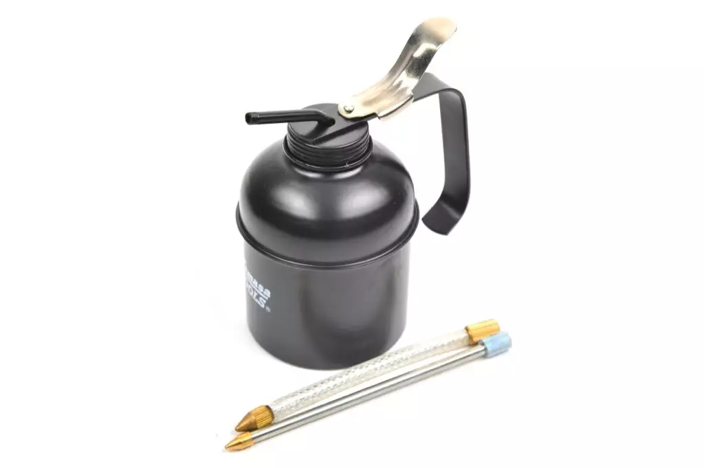 Metallinen öljykannu. Mukana toimitetaan sekä taipuisa että kiinteä nokka.