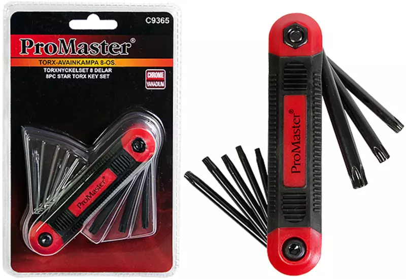 ProMaster -kromivanadium -terästä -8-osainen taitettava kampa sisältää koot T8, T10, T15, T20, T25, T27, T30, T40 -käteensopiva grip-kahva -IP-ripustinpakkaus -takuu 1 vuosi... Lue lisää