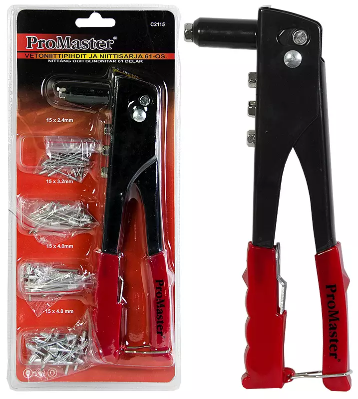 -sarja sisältää --vetoniittipihdit 235 mm --vetoniitit 15x2.4mm, 15x3.2mm, 15x4.0mm, 15x4.8mm -mukana kärjen vaihtoavain ja 4 vaihtokärkeä, koot: 2.4, 3.2, 4.0 ja 4.8 mm -pihdeissä... Lue lisää