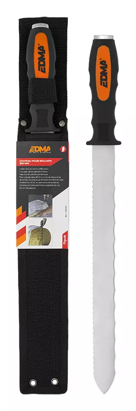 EDMA MADE IN FRANCE -terän pituus 300 mm -kokonaispituus 420 mm -terä on kaksoishammastettu -kankainen säilytyskotelo -symmetrinen kahden materiaalin kahva