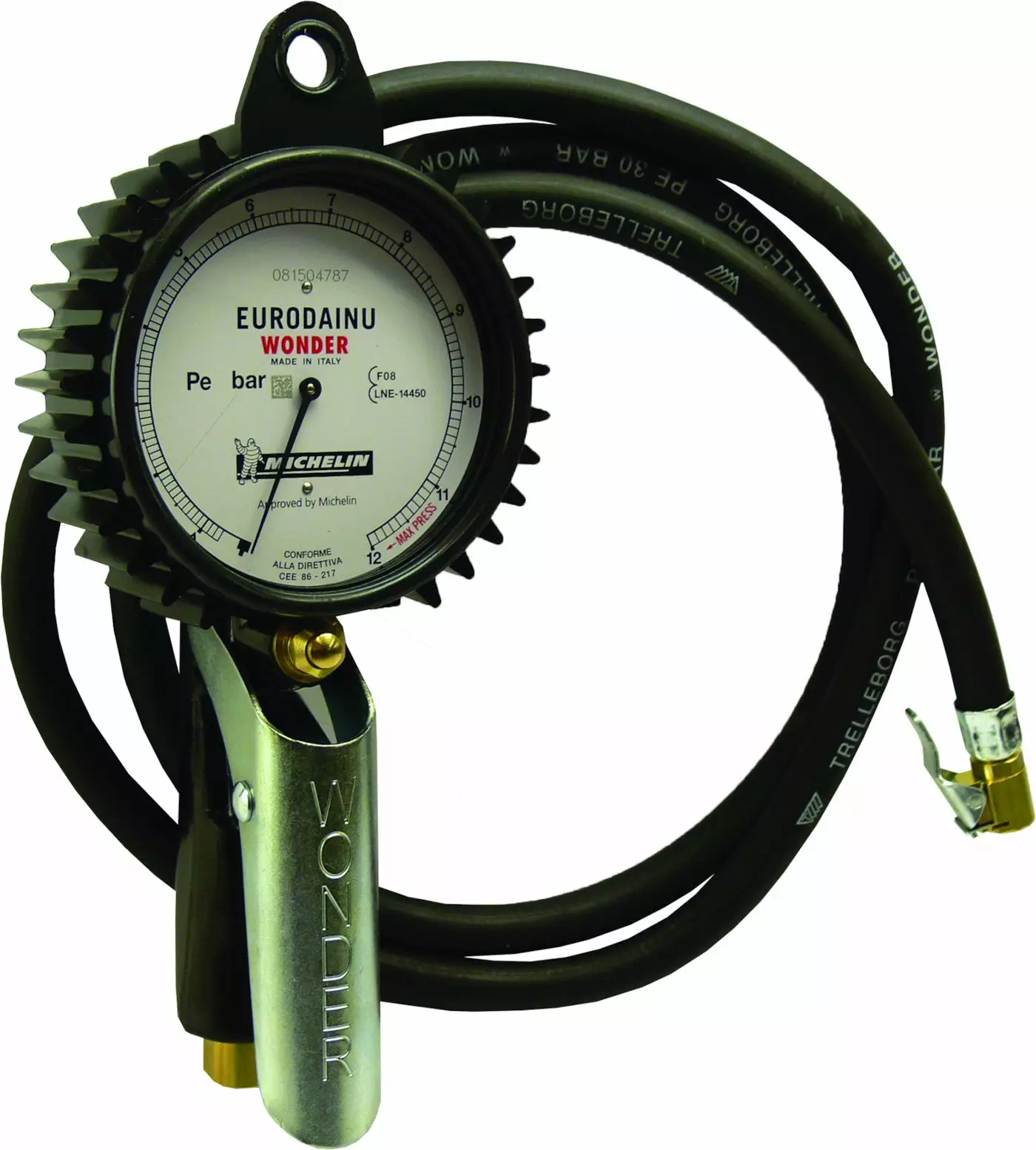 Eurodainu renkaantäyttölaite 1,5m letkulla ja bar/psi näytöllä. Asteikko bar (0.7-12) - psi (10-174). Standardin UNI EN 12645 mukainen.