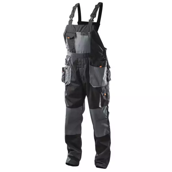 Musta/Harmaa. Vuoriton malli. Useita taskuja ja työkalulenkit. Työhaalarissa on vahvistettu kangas polvissa sekä polvisuojataskut. Haalarin materiaali 80% polyesteri, 20% puuvilla.