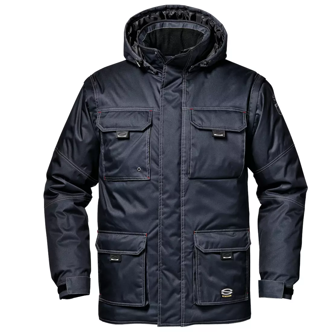 piilotettu vetoketjusulku neppareilla, kauluksen vuori ja hihansuut fleecekangasta, irrotettava vuorattu huppu, säädettävä kiristysnauhalla, irrotettavat hihat, neljä kolmiulotteista taskua läpällä ja neppareilla. Monikäyttöinen tasku läpällä ja tarrakiinnityksellä, merkinpidike, kynäpidike, puhelintasku ja lukuisia lokeroita, kaksi sisätaskua, sivutaskut, joustavat hihansuut säädettävissä tarralla.