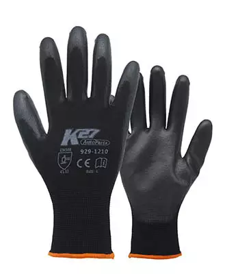 Erinomaisesti käteen muotoutuva musta polyesterisormikas, jonka kämmenessä on polyuretaanipinnoite.